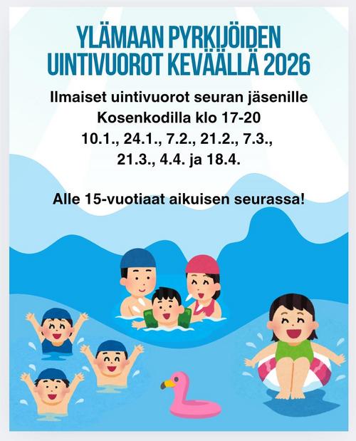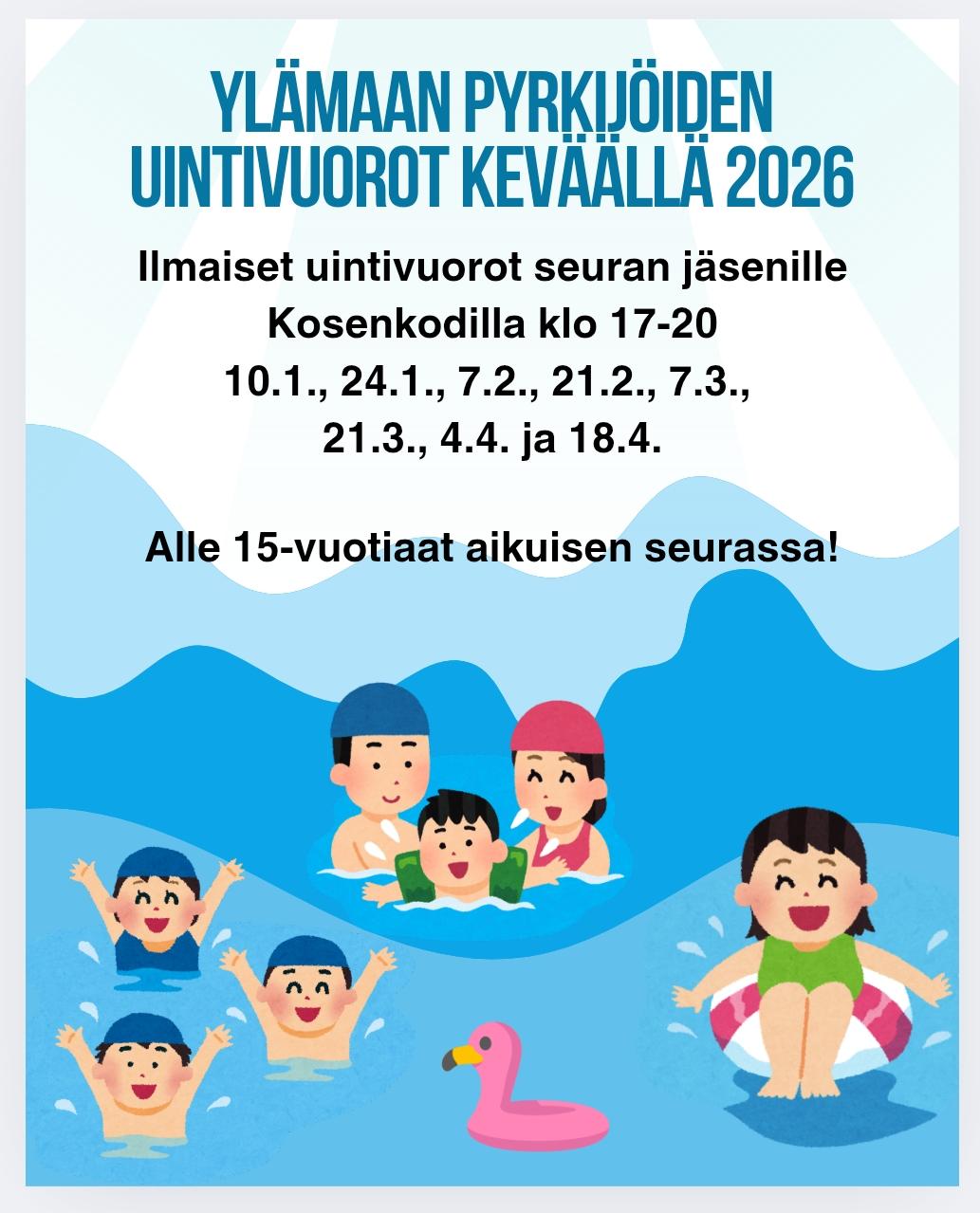 Ilmaiset uintivuorot seuran jäsenille Kosenkodilla klo 17-20 la 10.1., 24.1., 7.2., 21.2., 7.3., 21.3., 4.4. ja 18.4.